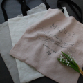 フランジュールカルチャーサロンとのコラボレーションにより実現したこのトートバッグは、竹内氏が特別に描き下ろした「ミュゲ(すずらん)」の繊細なカリグラフィーが目を引く、時代を問わず愛される一品です。